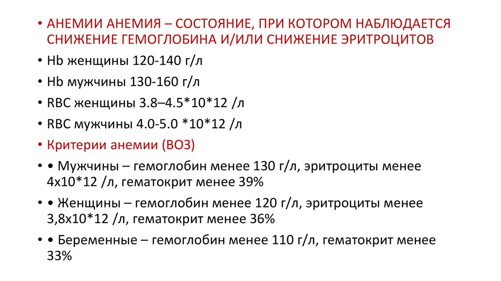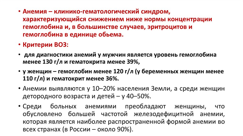 • Анемия – клинико-гематологический синдром,характеризующийся снижением ниже нормы концентрации