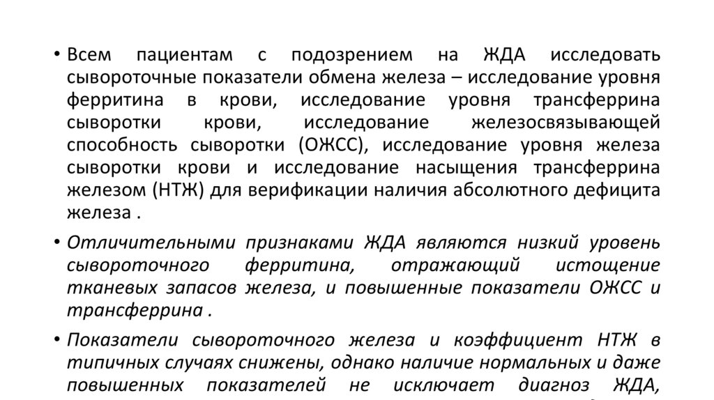 сывороточного железа и трансферрина, как правило, снижены,