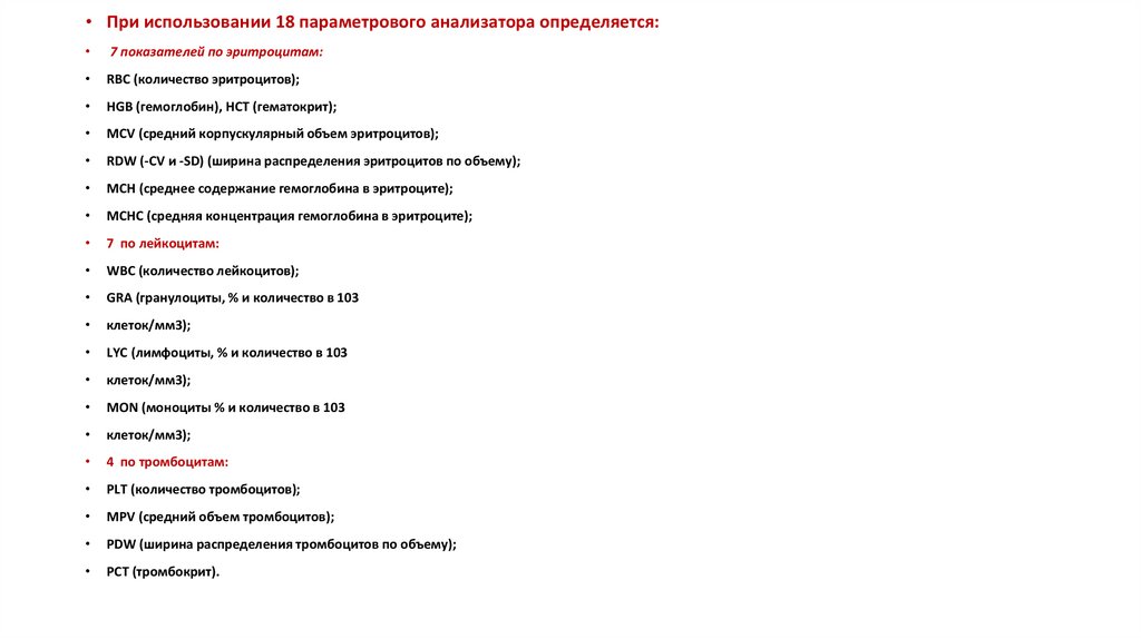 • При использовании 18 параметрового анализатора определяется:7 показателей по эритроцитам: