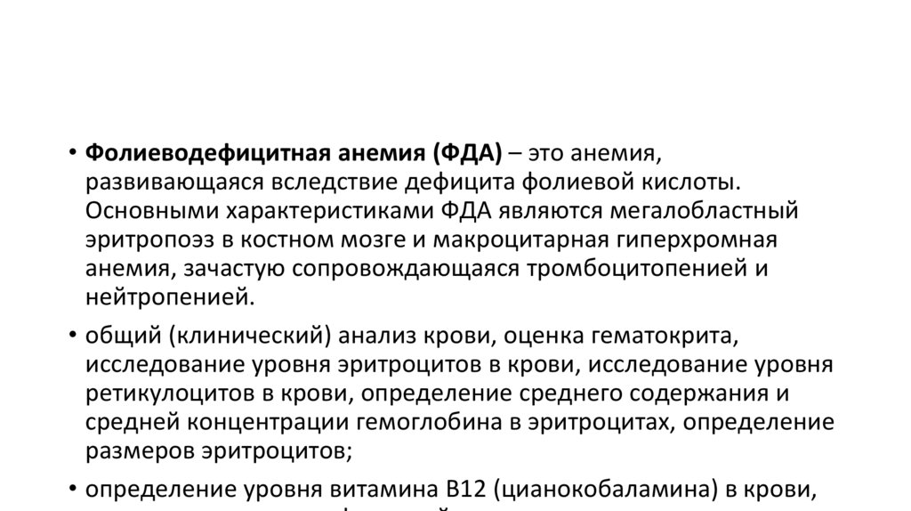 • Фолиеводефицитная анемия (ФДА) – это анемия,развивающаяся вследствие дефицита фолиевой кислоты.