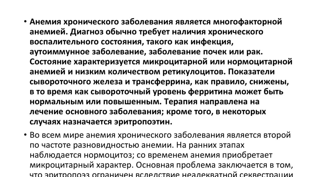 • Анемия хронического заболевания является многофакторнойанемией. Диагноз обычно требует наличия хронического