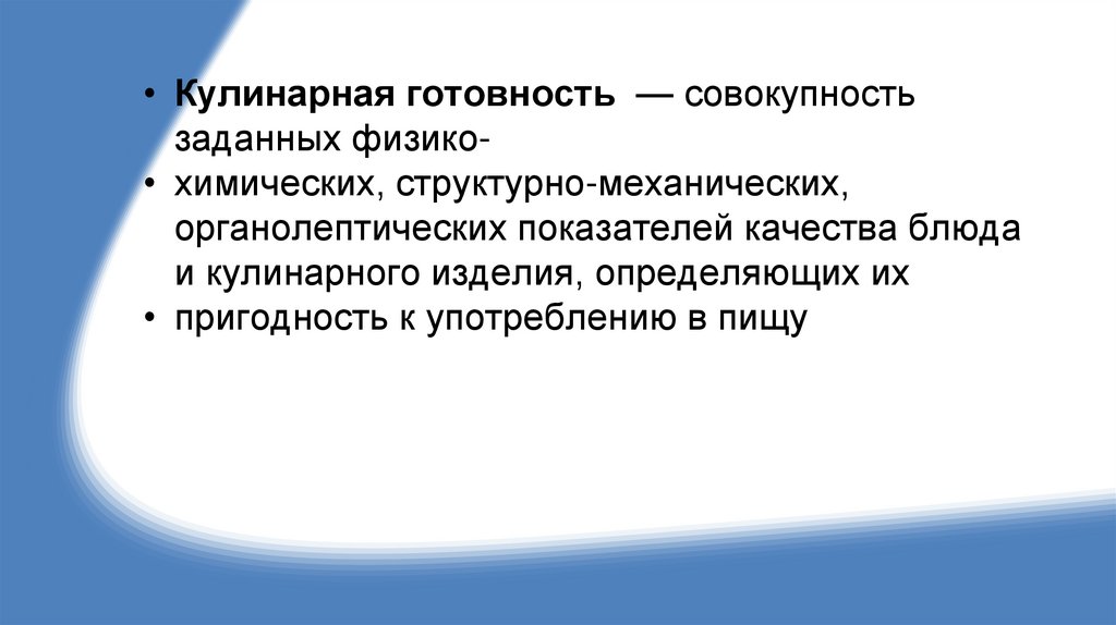 • Кулинарная готовность — совокупностьзаданных физико• химических, структурно-механических,