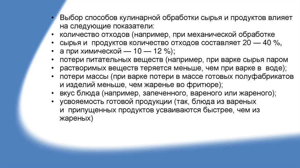 • потери питательных веществ (например, при варке сырья паром