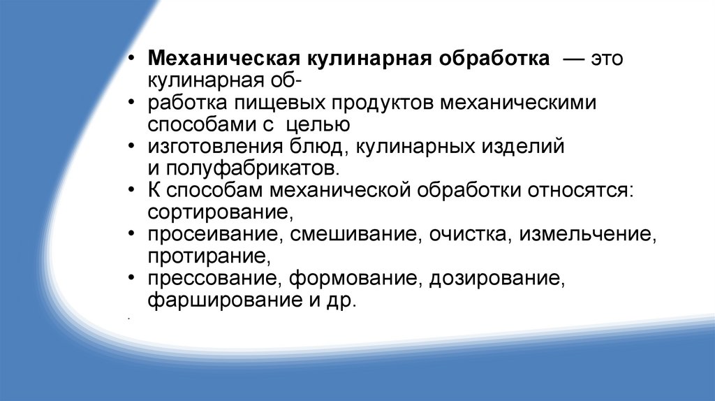 • Механическая кулинарная обработка — этокулинарная об• работка пищевых продуктов механическими