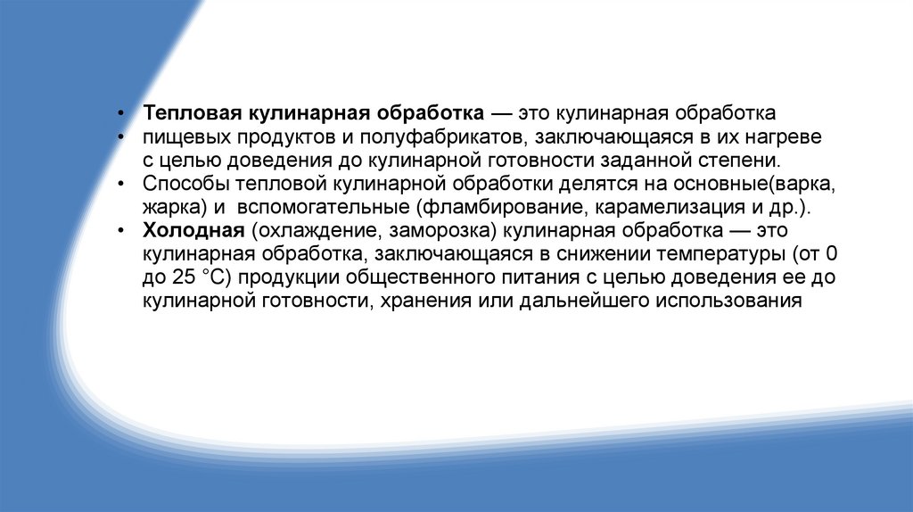 • Тепловая кулинарная обработка — это кулинарная обработка• пищевых продуктов и полуфабрикатов, заключающаяся в их нагреве