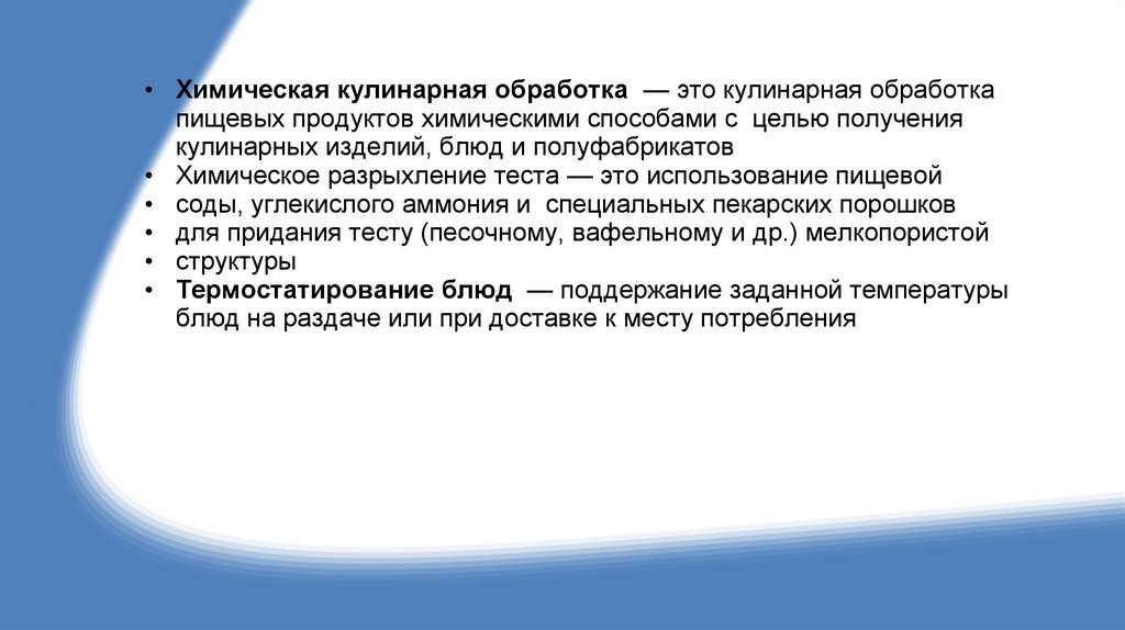 • Химическая кулинарная обработка — это кулинарная обработкапищевых продуктов химическими способами с целью получения
