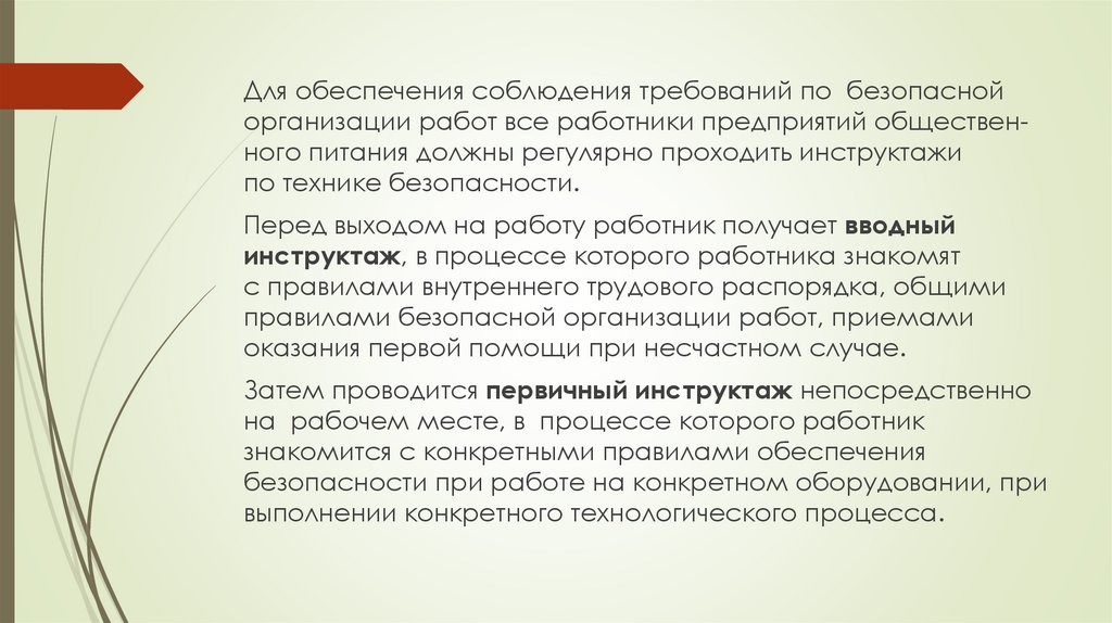 Для обеспечения соблюдения требований по безопаснойорганизации работ все работники предприятий общественного питания должны регулярно проходить инструктажи