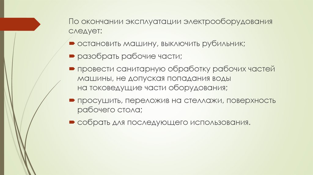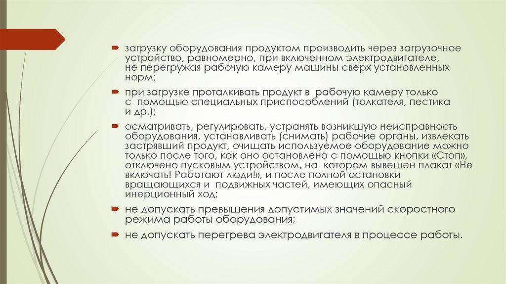 не допускать замены, переустановки съемных частейоборудования при включенном электродвигателе;