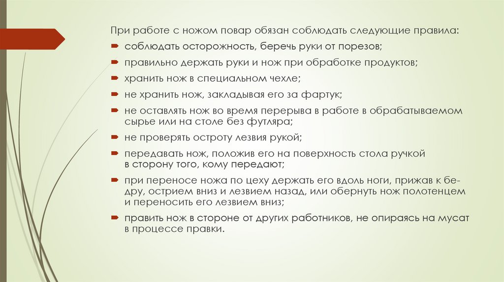 При работе с ножом повар обязан соблюдать следующие правила:соблюдать осторожность, беречь руки от порезов;
