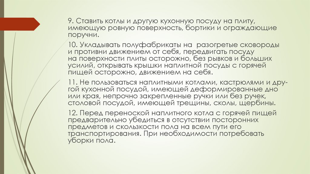 9. Ставить котлы и другую кухонную посуду на плиту,имеющую ровную поверхность, бортики и ограждающие