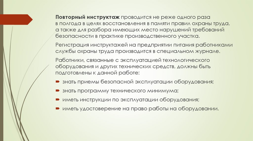 Повторный инструктаж проводится не реже одного разав полгода в целях восстановления в памяти правил охраны труда,
