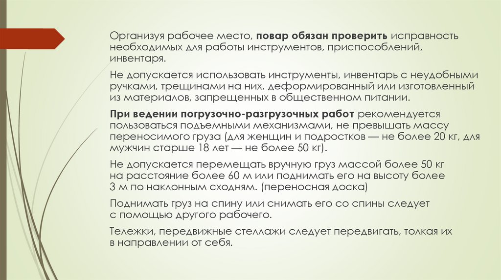 переносимого груза (для женщин и подростков — не более 20 кг, для