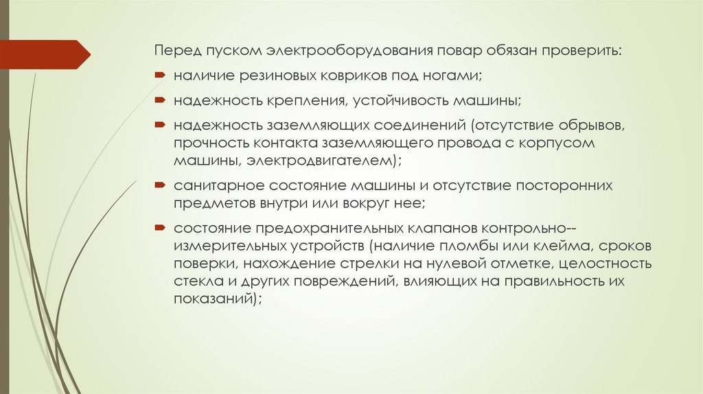 Перед пуском электрооборудования повар обязан проверить:наличие резиновых ковриков под ногами;