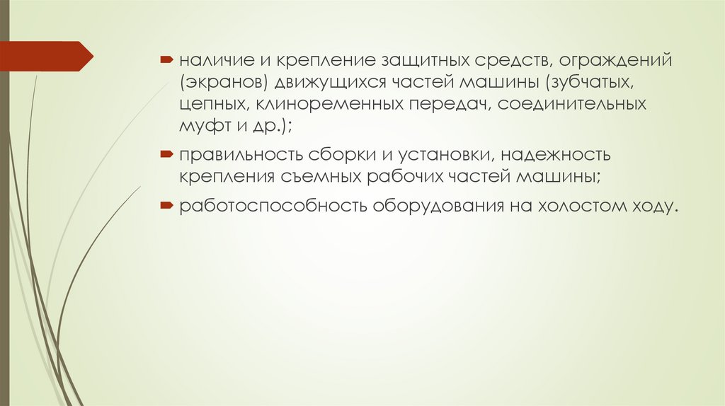 наличие и крепление защитных средств, ограждений(экранов) движущихся частей машины (зубчатых,