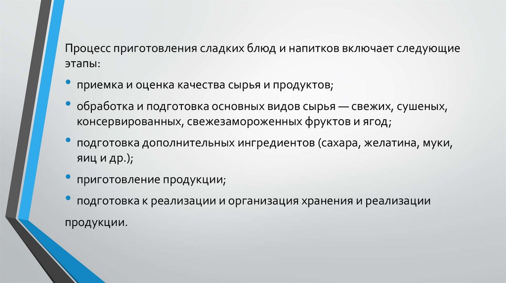 Процесс приготовления сладких блюд и напитков включает следующиеэтапы: