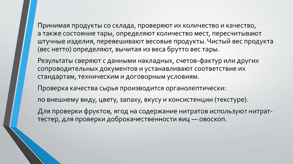 Принимая продукты со склада, проверяют их количество и качество,а также состояние тары, определяют количество мест, пересчитывают