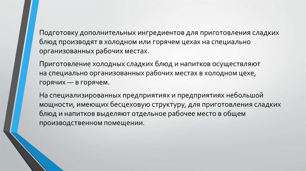 Подготовку дополнительных ингредиентов для приготовления сладкихблюд производят в холодном или горячем цехах на специально