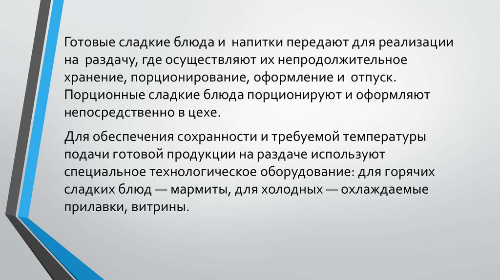 Готовые сладкие блюда и напитки передают для реализациина раздачу, где осуществляют их непродолжительное