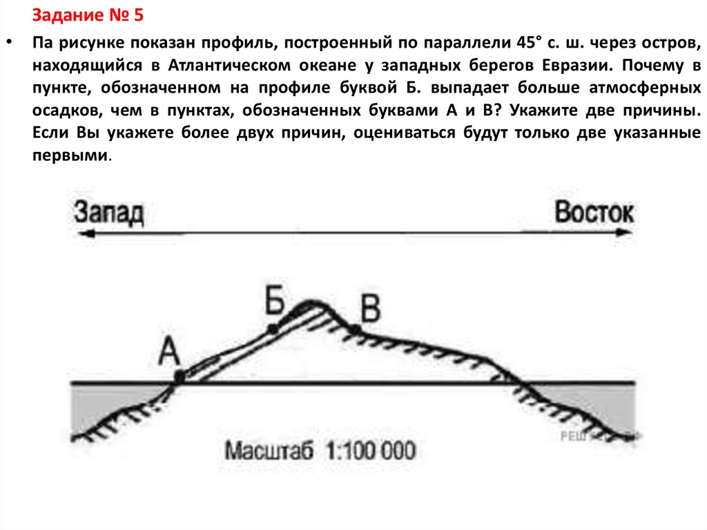 Задание № 5Па рисунке показан профиль, построенный по параллели 45° с. ш. через остров,
