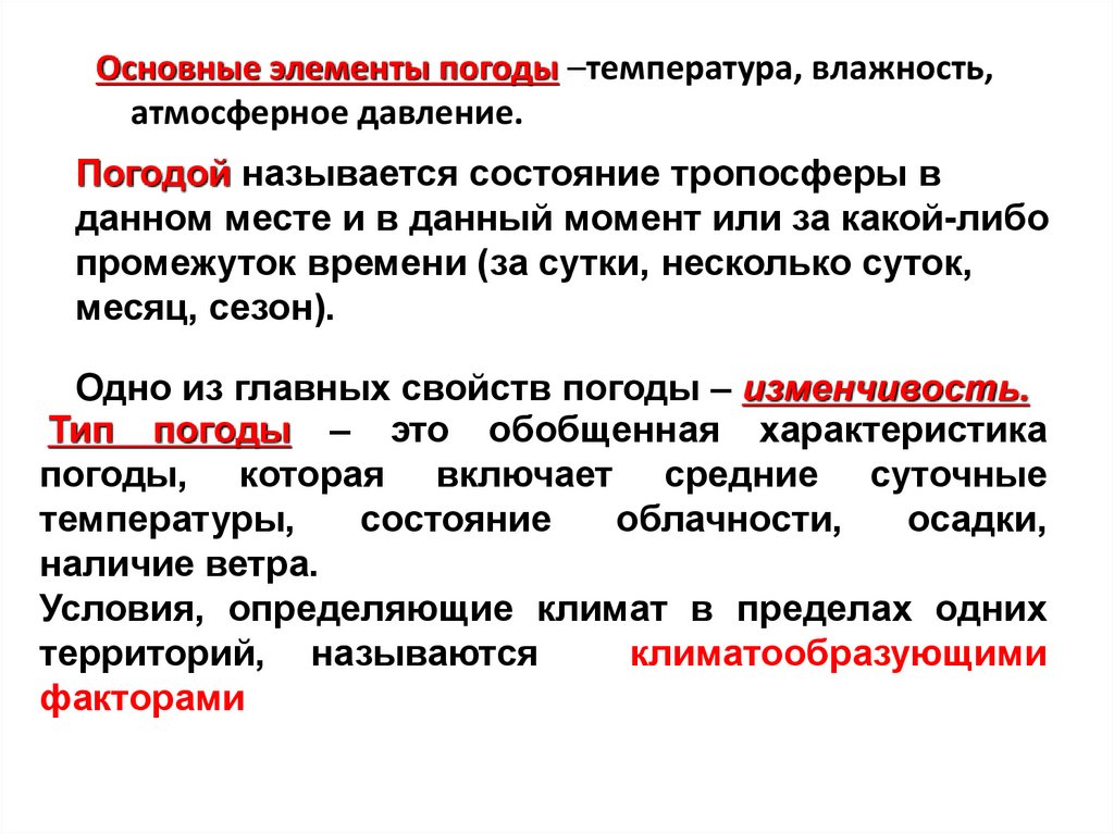 Основные элементы погоды –температура, влажность,атмосферное давление.