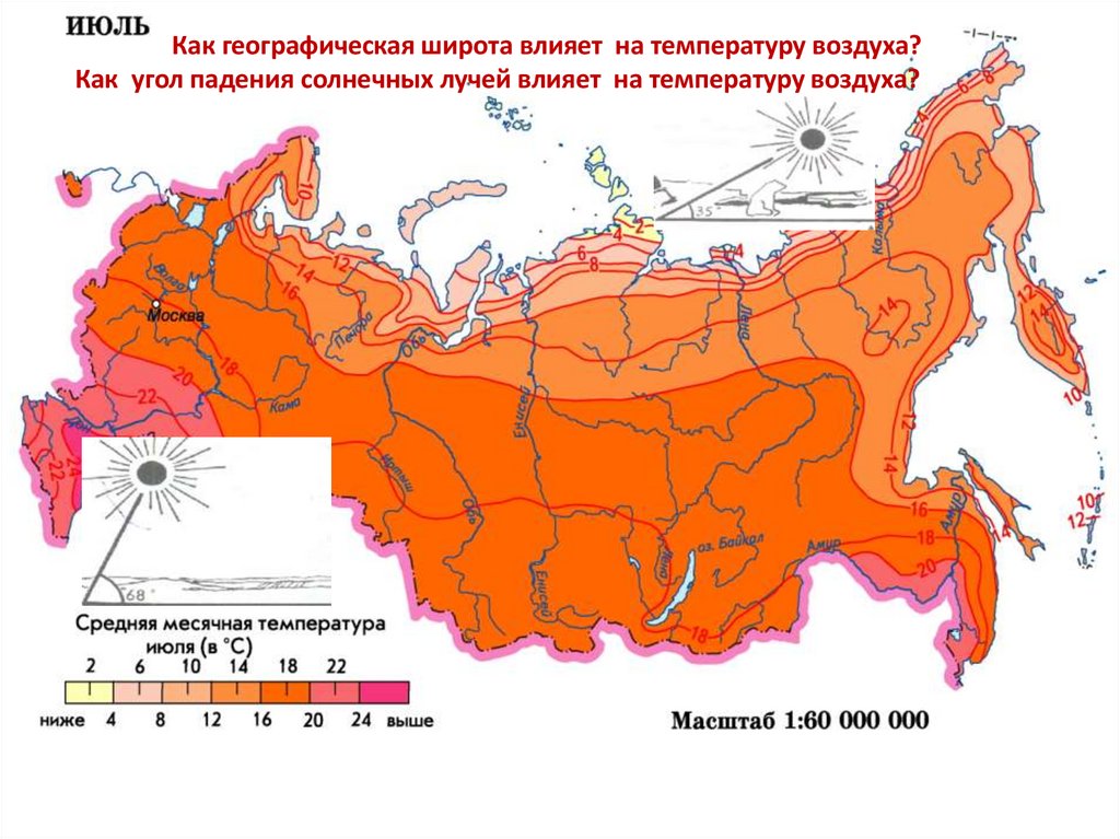 Как географическая широта влияет на температуру воздуха?Как угол падения солнечных лучей влияет на температуру воздуха?