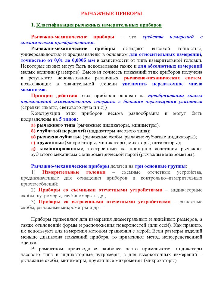 РЫЧАЖНЫЕ ПРИБОРЫ1. Классификация рычажных измерительных приборов