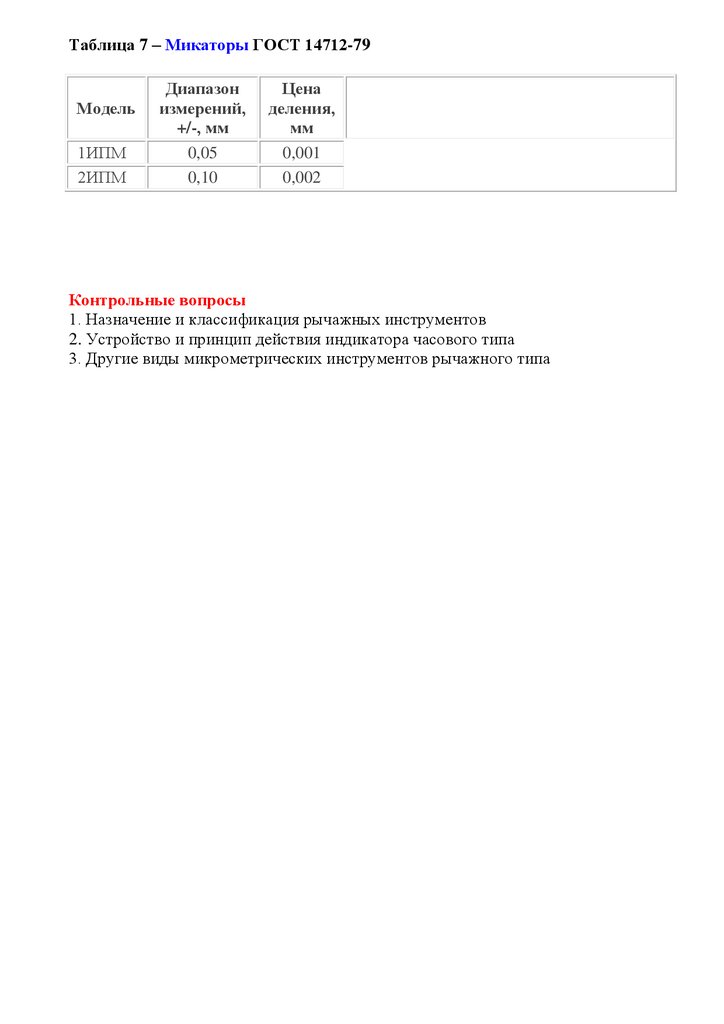 Таблица 7 – Микаторы ГОСТ 14712-79Модель