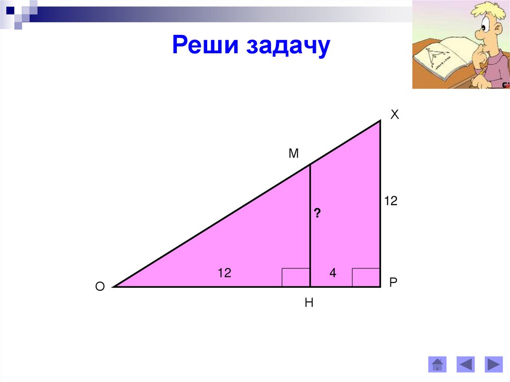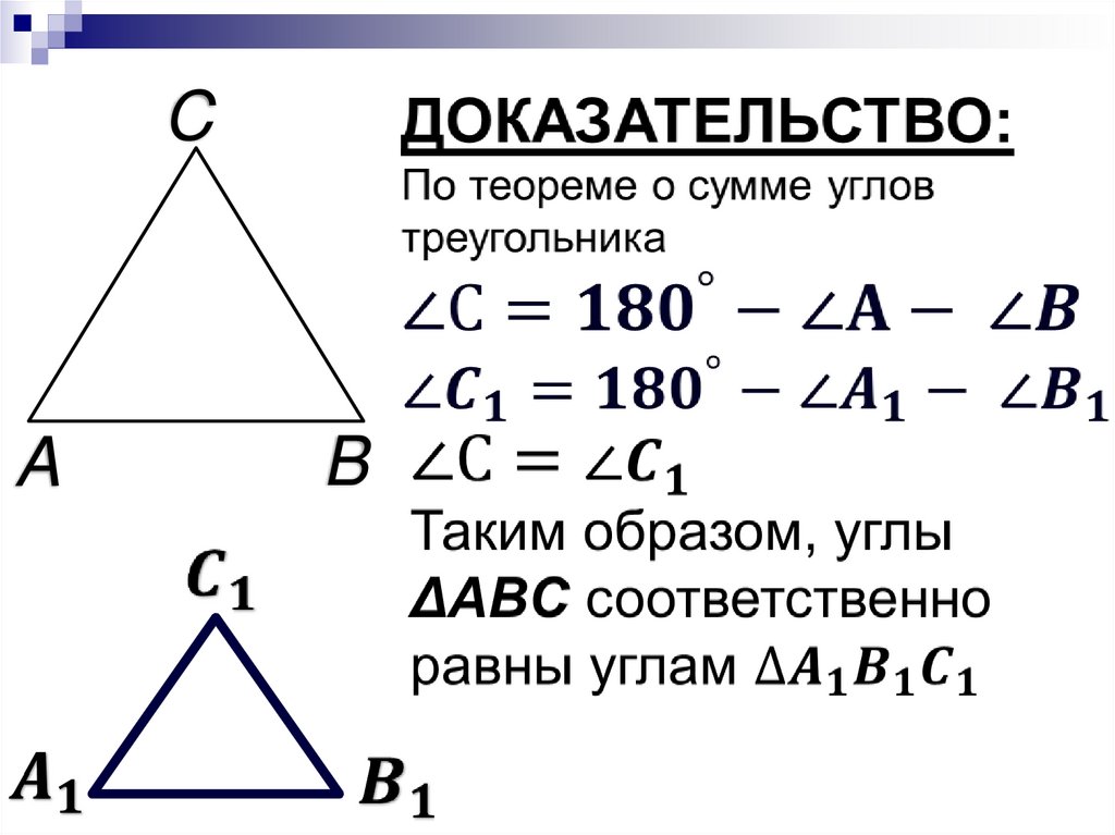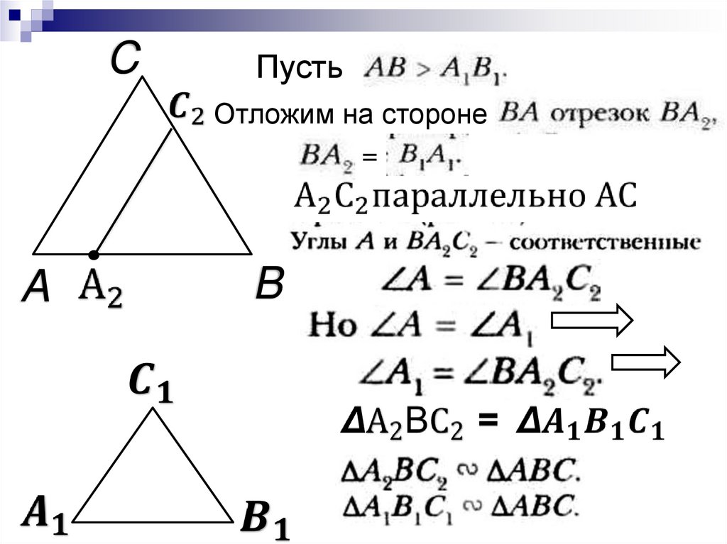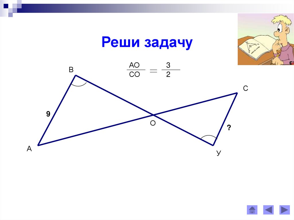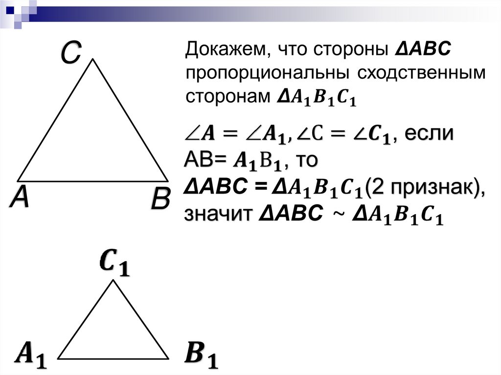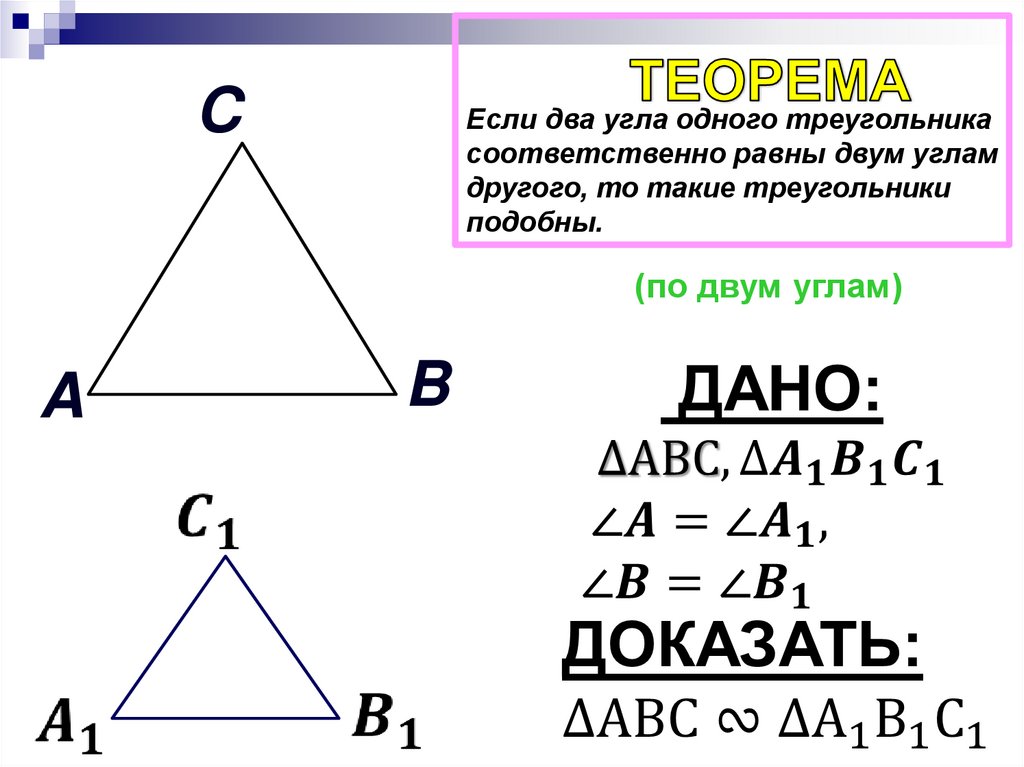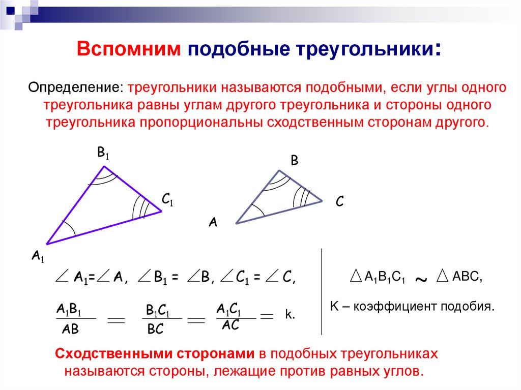 Вспомним подобные треугольники:Определение: треугольники называются подобными, если углы одного