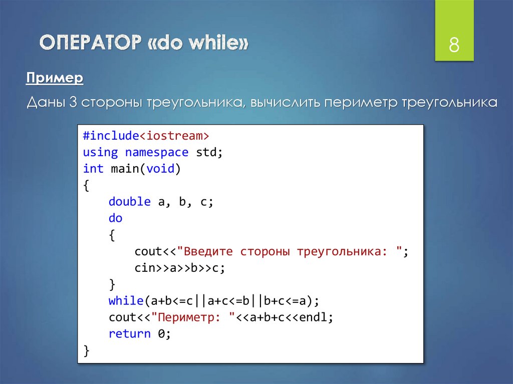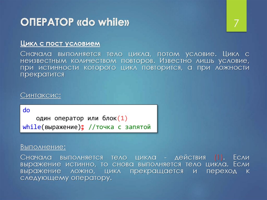 Сначала выполняется тело цикла, потом условие. Цикл с