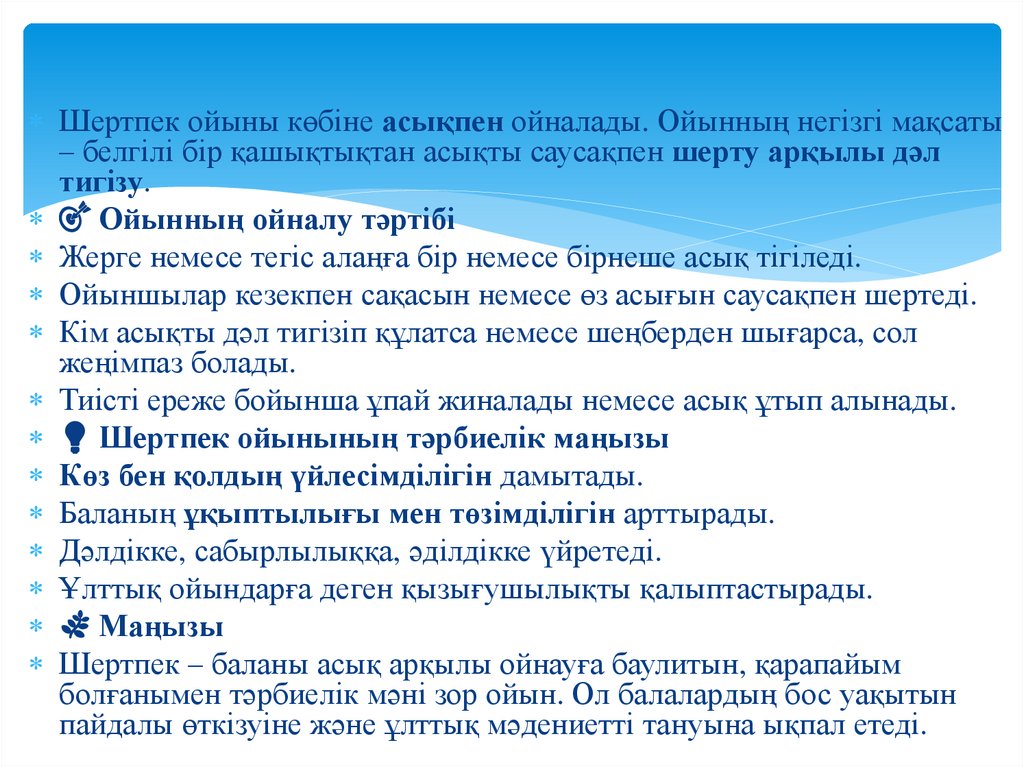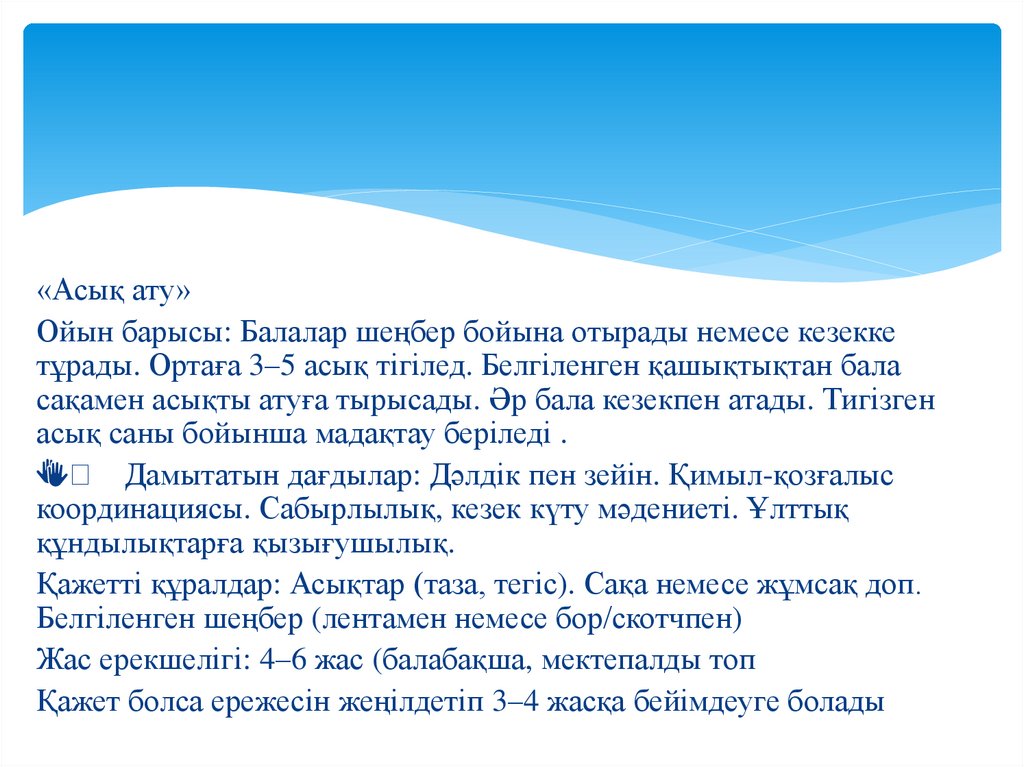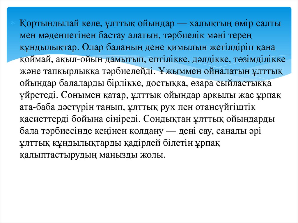 Ұлттық ойындардың бала дамуына ықпалы өте зор әрі көпқырлы. Олар баланың дене, ақыл-ой, әлеуметтік және рухани дамуын қатар