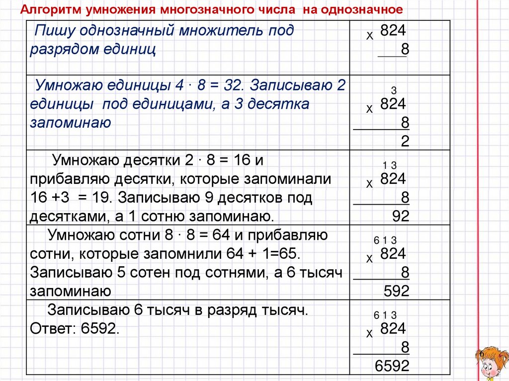 Алгоритм умножения многозначного числа на однозначноеПишу однозначный множитель под