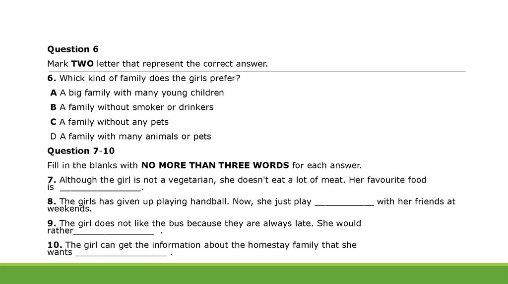 7. Although the girl is not a vegetarian, she doesn't eat a lot of meat. Her favourite food