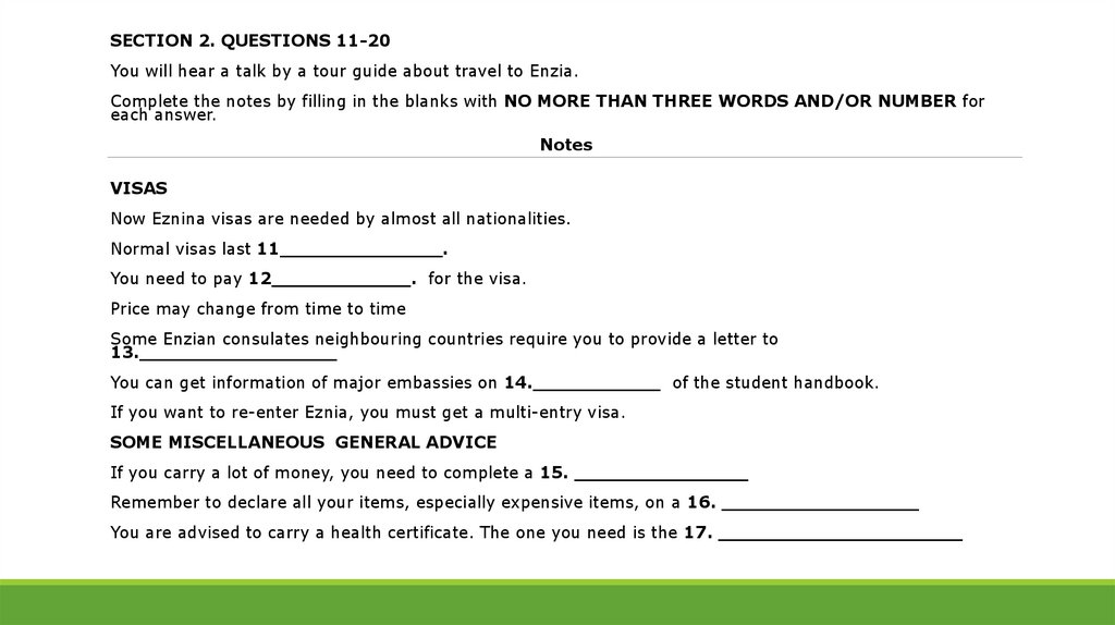 SECTION 2. QUESTIONS 11-20You will hear a talk by a tour guide about travel to Enzia.