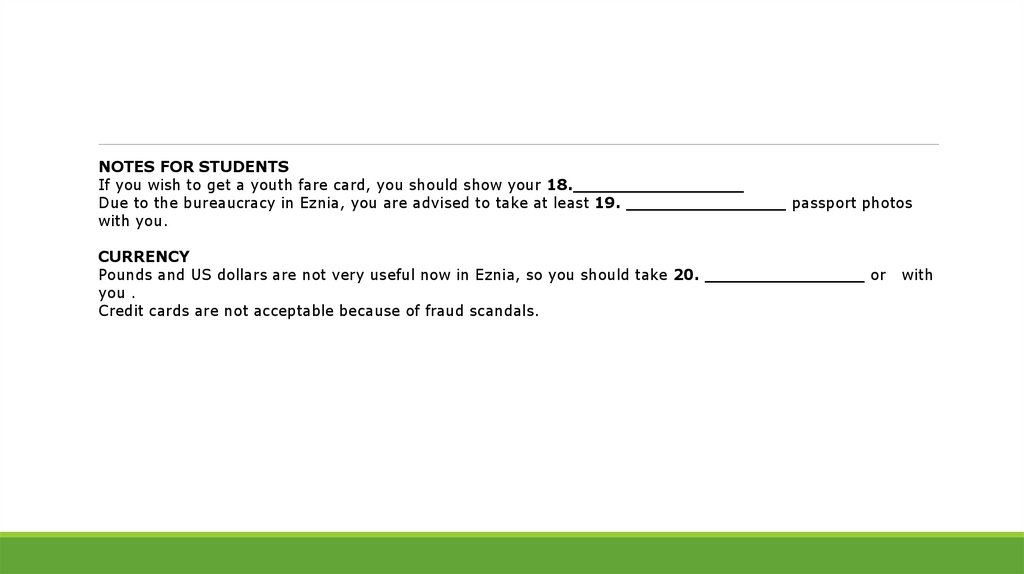 NOTES FOR STUDENTSIf you wish to get a youth fare card, you should show your 18.________________
