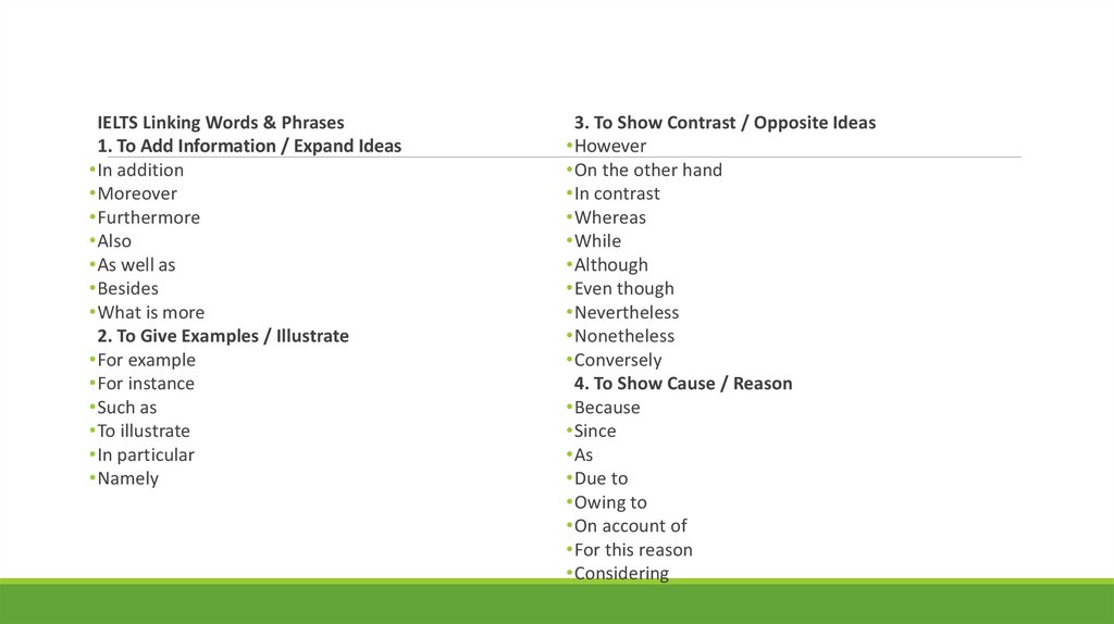 IELTS Linking Words & Phrases1. To Add Information / Expand Ideas