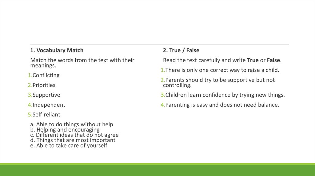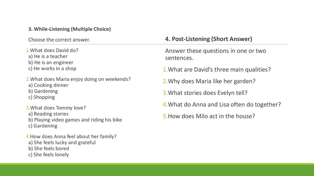 1. Pre-Listening (Vocabulary Preparation)2. While-Listening (True / False)