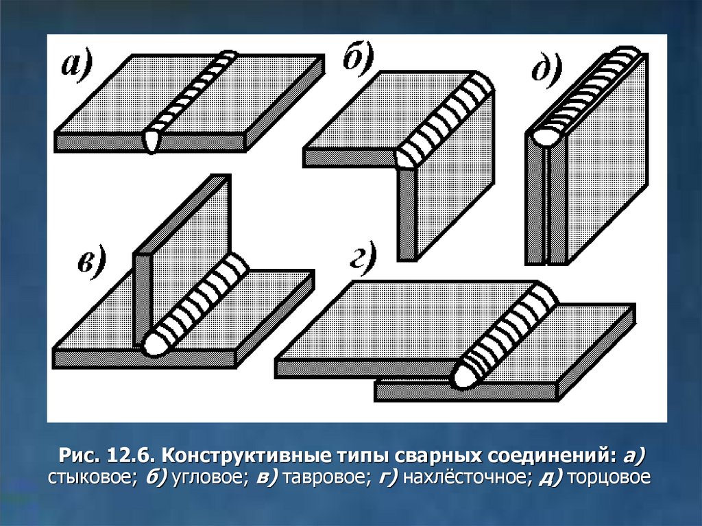 Рис. 12.6. Конструктивные типы сварных соединений: а)стыковое; б) угловое; в) тавровое; г) нахлёсточное; д) торцовое
