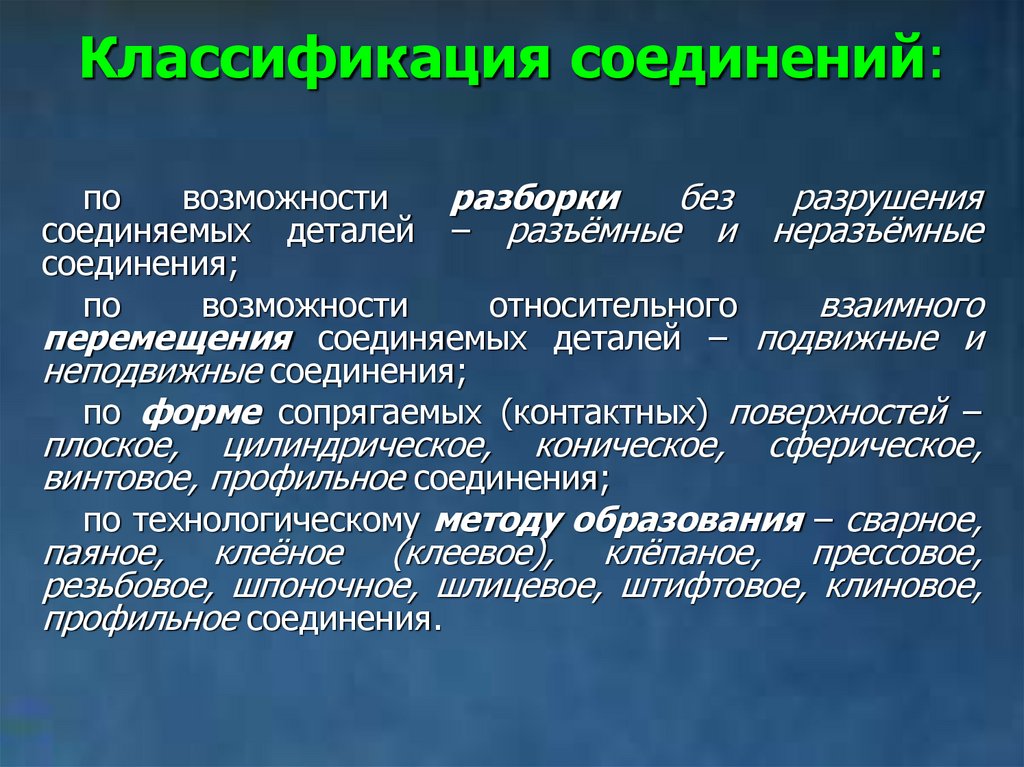 резьбовое, шпоночное, шлицевое, штифтовое, клиновое,
