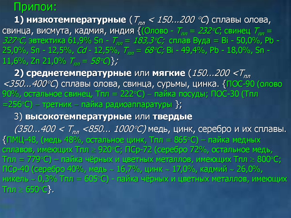 <350...400 С) сплавы олова, свинца, сурьмы, цинка. {ПОС-90 (олово