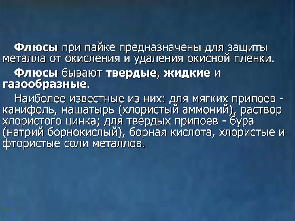 Флюсы при пайке предназначены для защитыметалла от окисления и удаления окисной пленки.