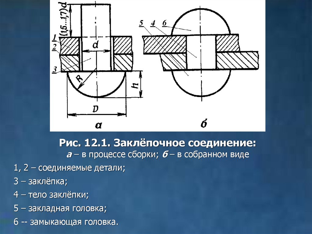 Рис. 12.1. Заклёпочное соединение:а – в процессе сборки; б – в собранном виде