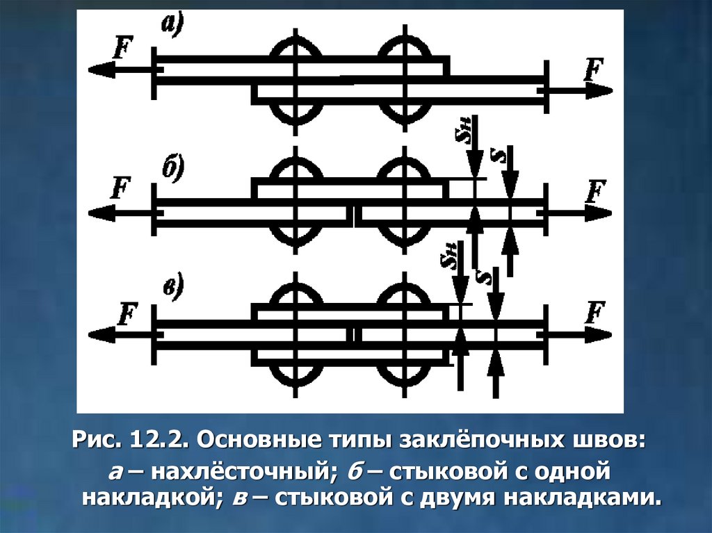 Рис. 12.2. Основные типы заклёпочных швов:а – нахлёсточный; б – стыковой с одной