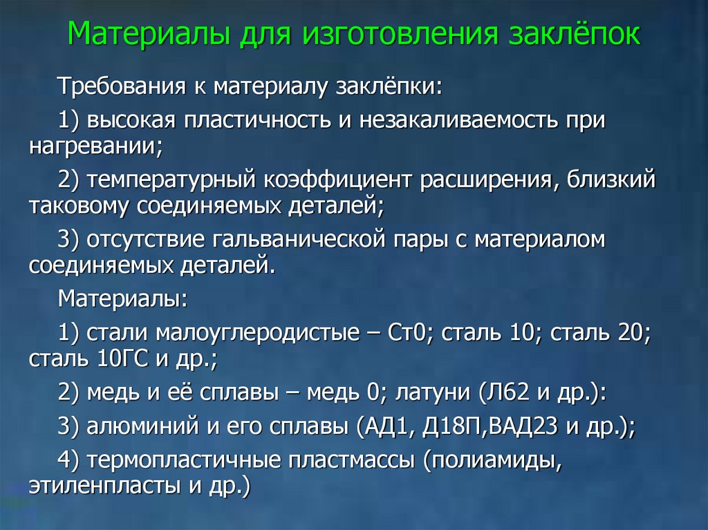 Материалы для изготовления заклёпокТребования к материалу заклёпки: