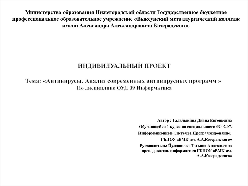 1. ИНДИВИДУАЛЬНЫЙ ПРОЕКТ Тема: «Антивирусы. Анализ современных антивирусных программ » По дисциплине ОУД 09 Информатика