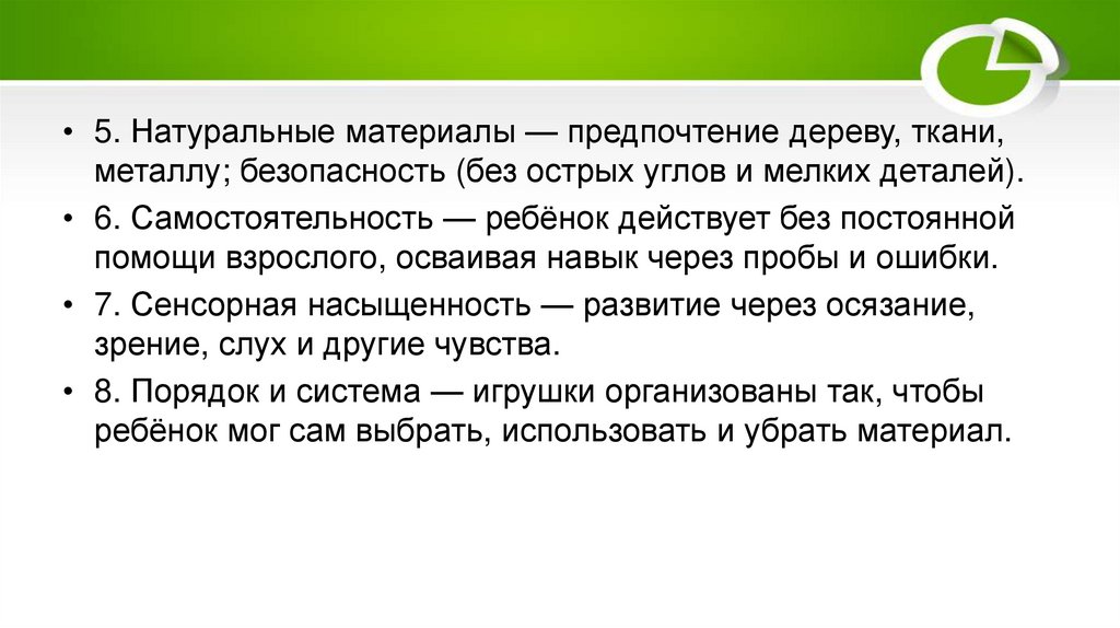 • 5. Натуральные материалы — предпочтение дереву, ткани,металлу; безопасность (без острых углов и мелких деталей).