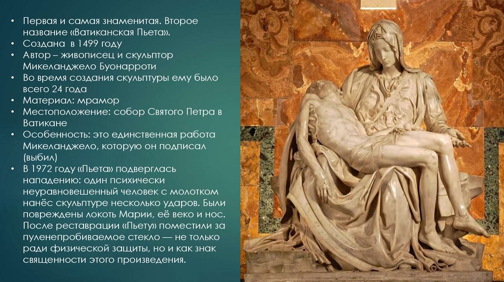 • Первая и самая знаменитая. Второеназвание «Ватиканская Пьета».