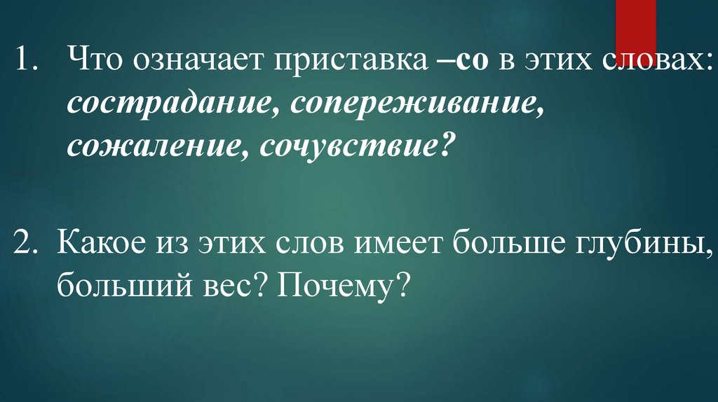 1. Что означает приставка –со в этих словах:сострадание, сопереживание,