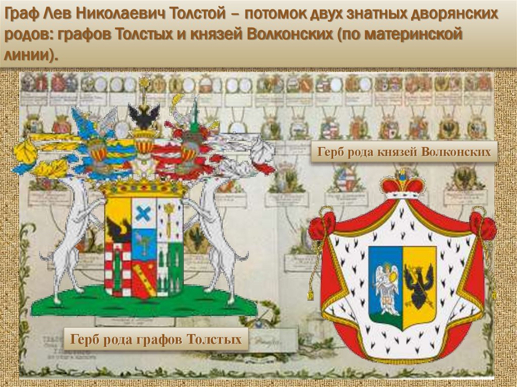 Граф Лев Николаевич Толстой – потомок двух знатных дворянскихродов: графов Толстых и князей Волконских (по материнской