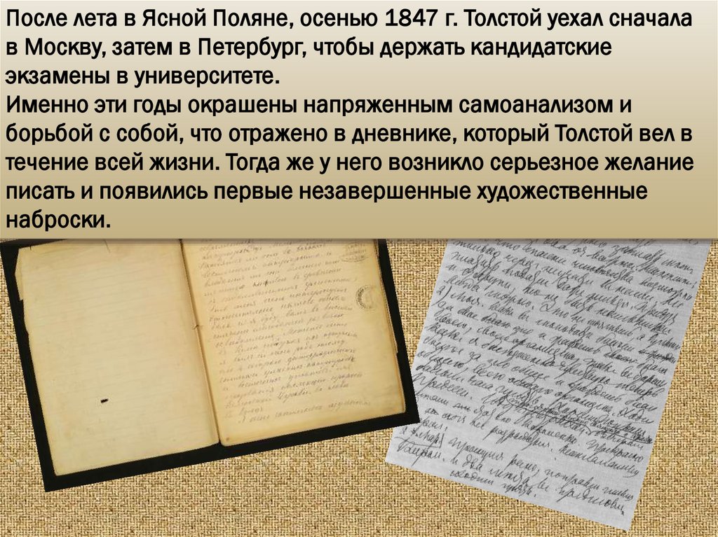 После лета в Ясной Поляне, осенью 1847 г. Толстой уехал сначалав Москву, затем в Петербург, чтобы держать кандидатские