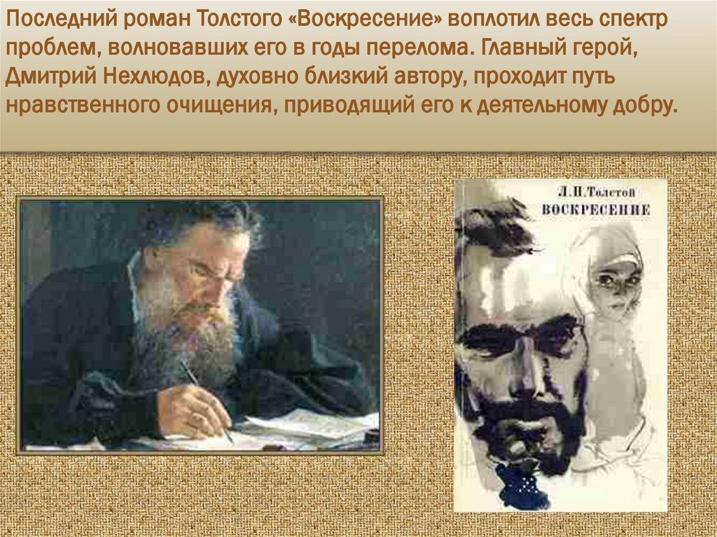 Последний роман Толстого «Воскресение» воплотил весь спектрпроблем, волновавших его в годы перелома. Главный герой,